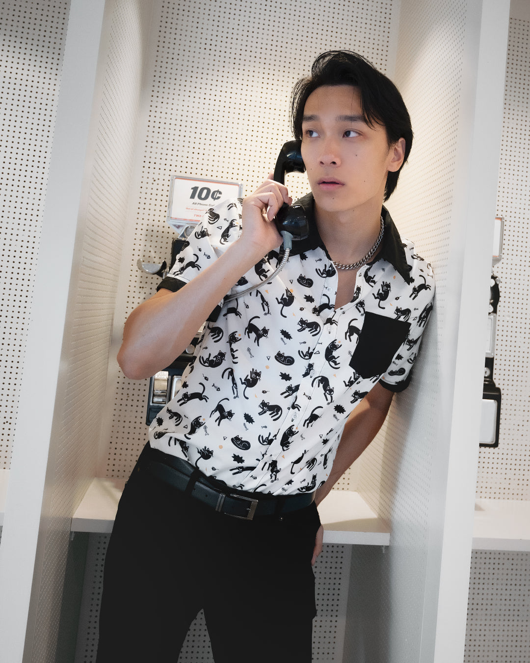 Original BLACK CAT design by KINWA printed on a 100% polyester UNISEX button-up short sleeve shirt.