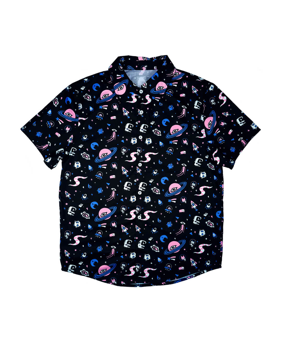 Original GALAXY design by KINWA printed on a 100% polyester UNISEX button-up short sleeve shirt.