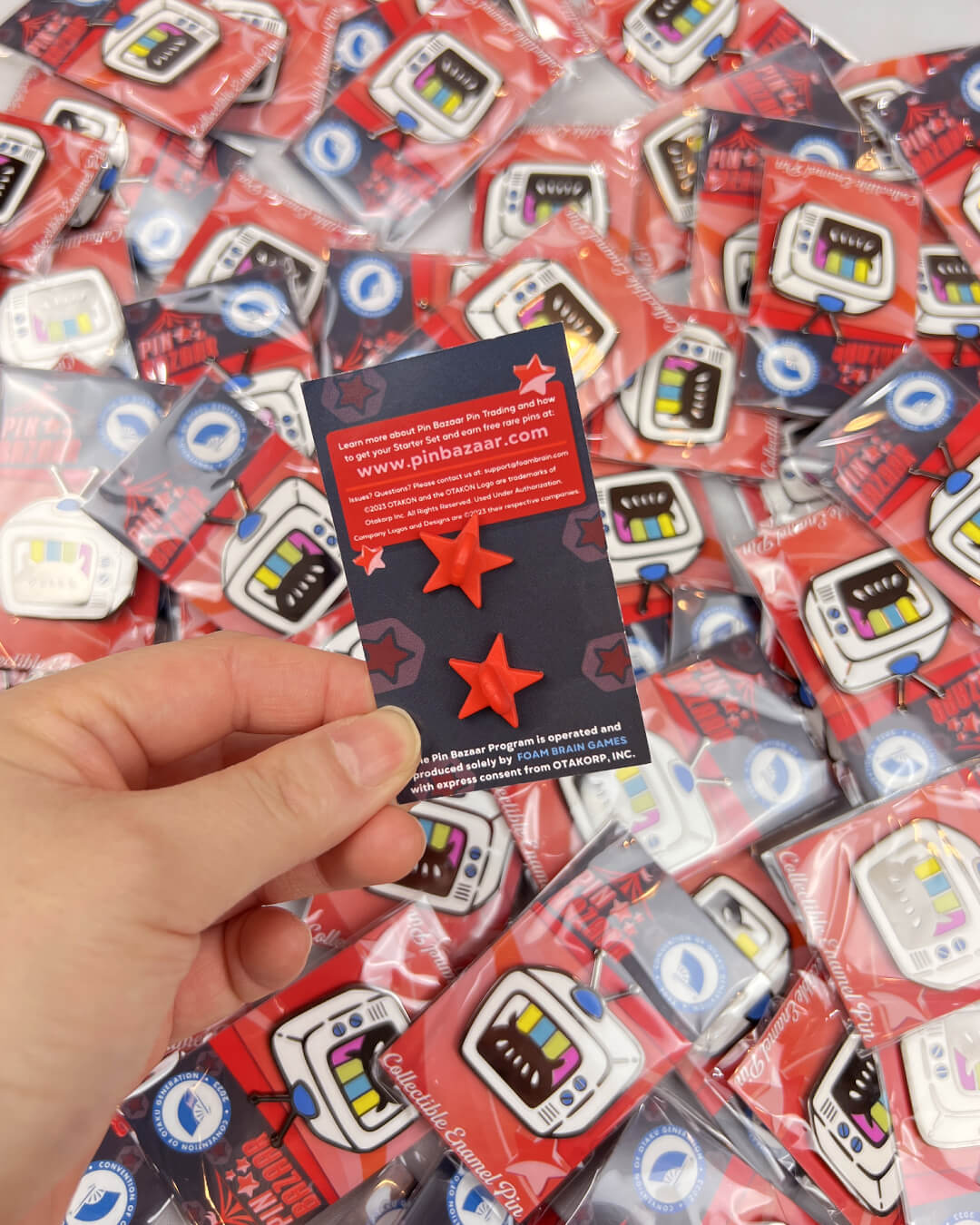 Approximately 2 inch (5cm) black nickel plated enamel pin from Otakon 2023's Exclusive Pin Bazaar! Has star shaped pin backings and comes with the Pin Bazaar backing card!
