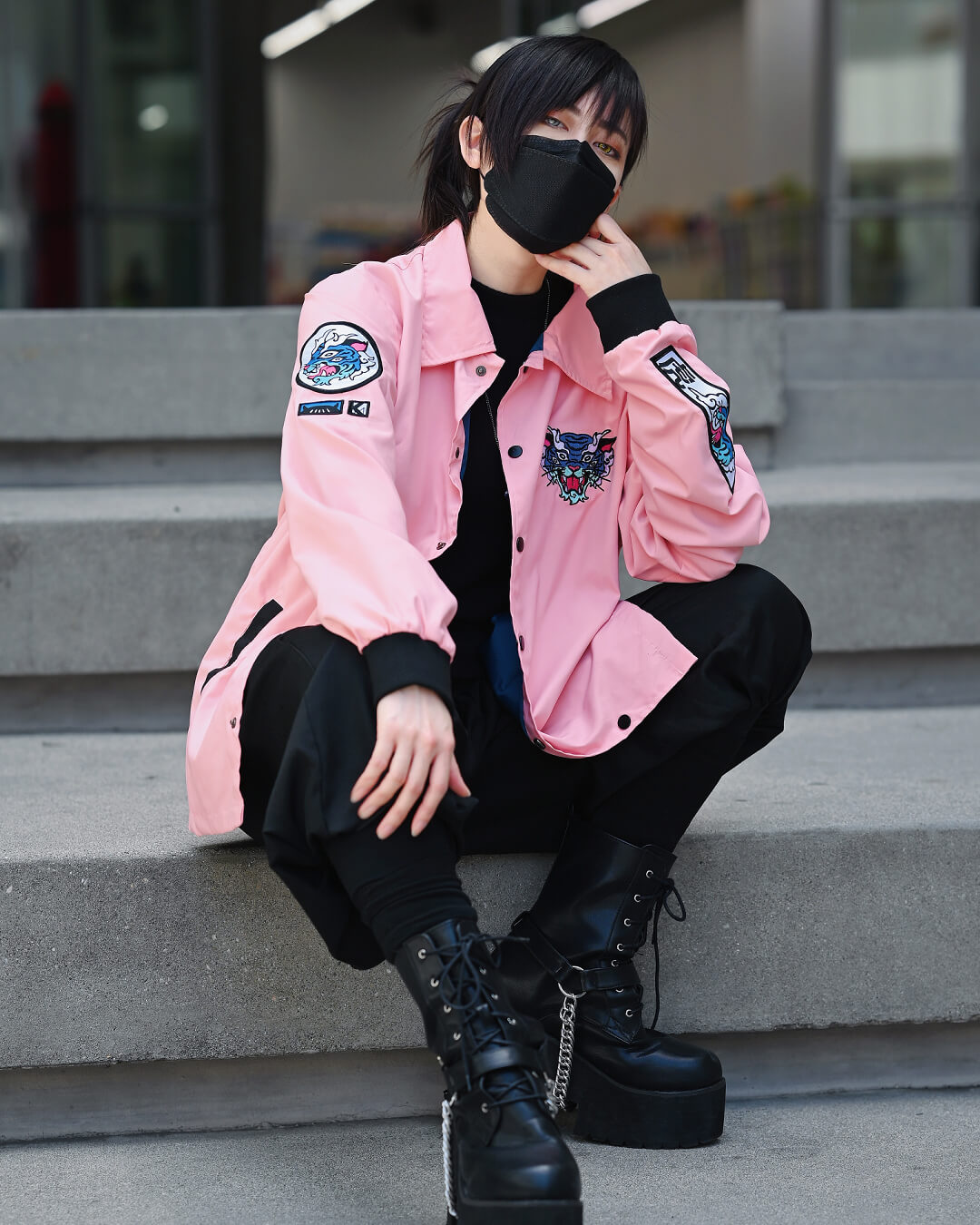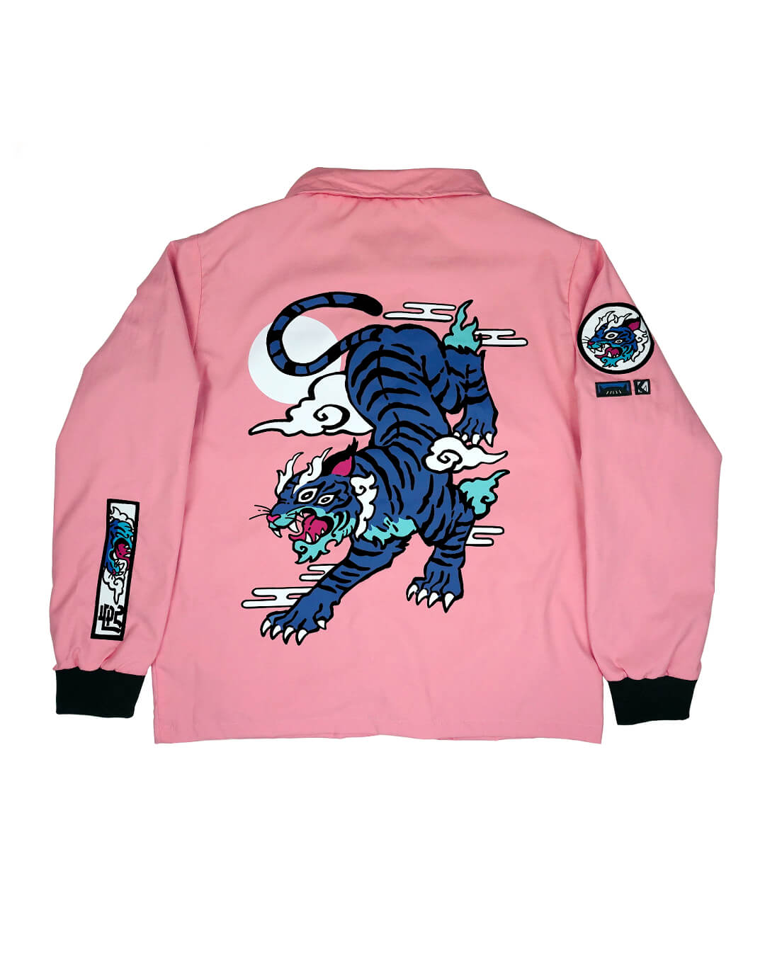 Original TIGER design by KINWA for LUNAR NEW YEAR 2022! Silkscreened on a pink 100% polyester windbreaker jacket. Comes embellished with TIGER embroidery patches.