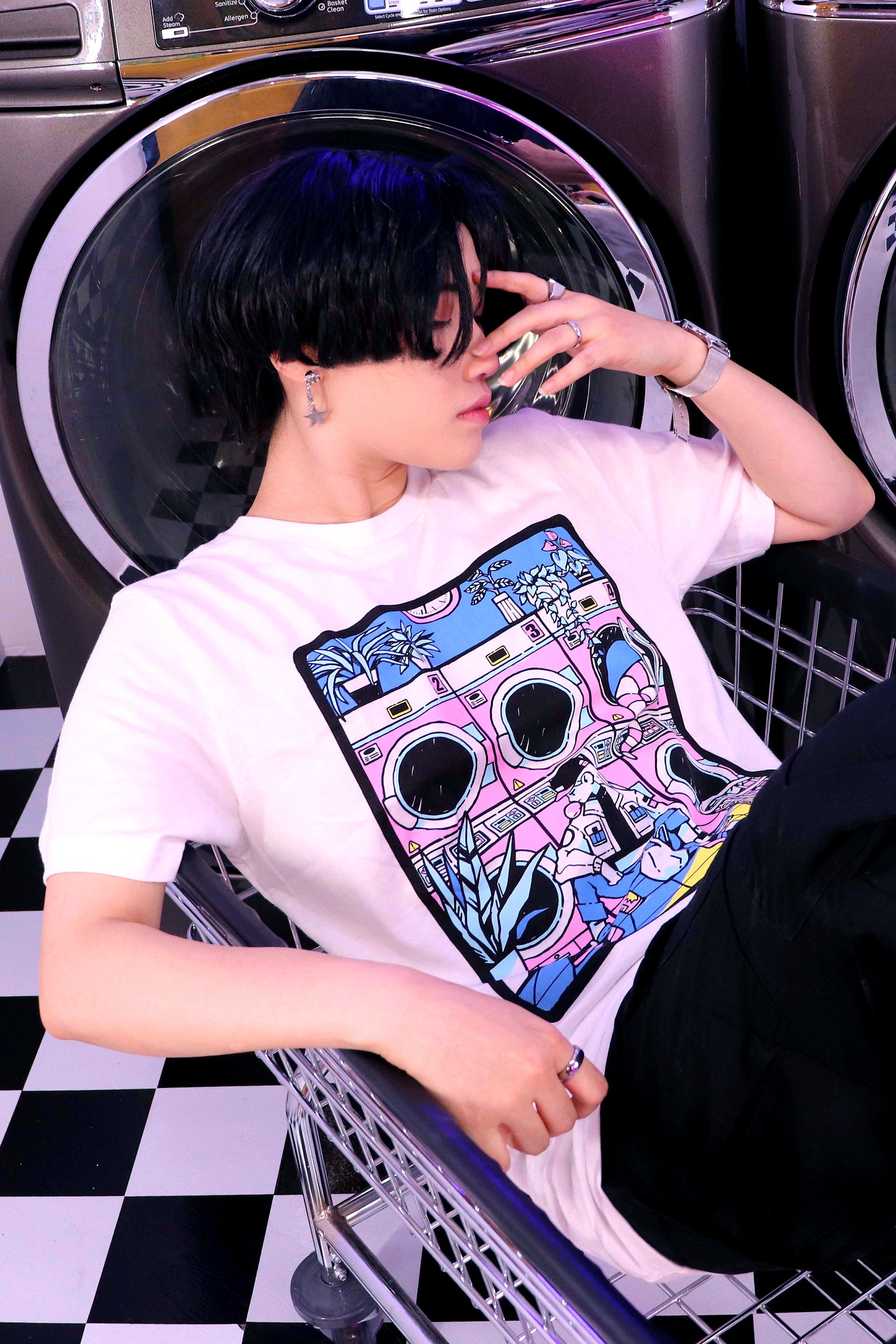 Original LAUNDROMAT design by KINWA printed on a 100% ring spun cotton UNISEX white t-shirt. Model is wearing a medium.
