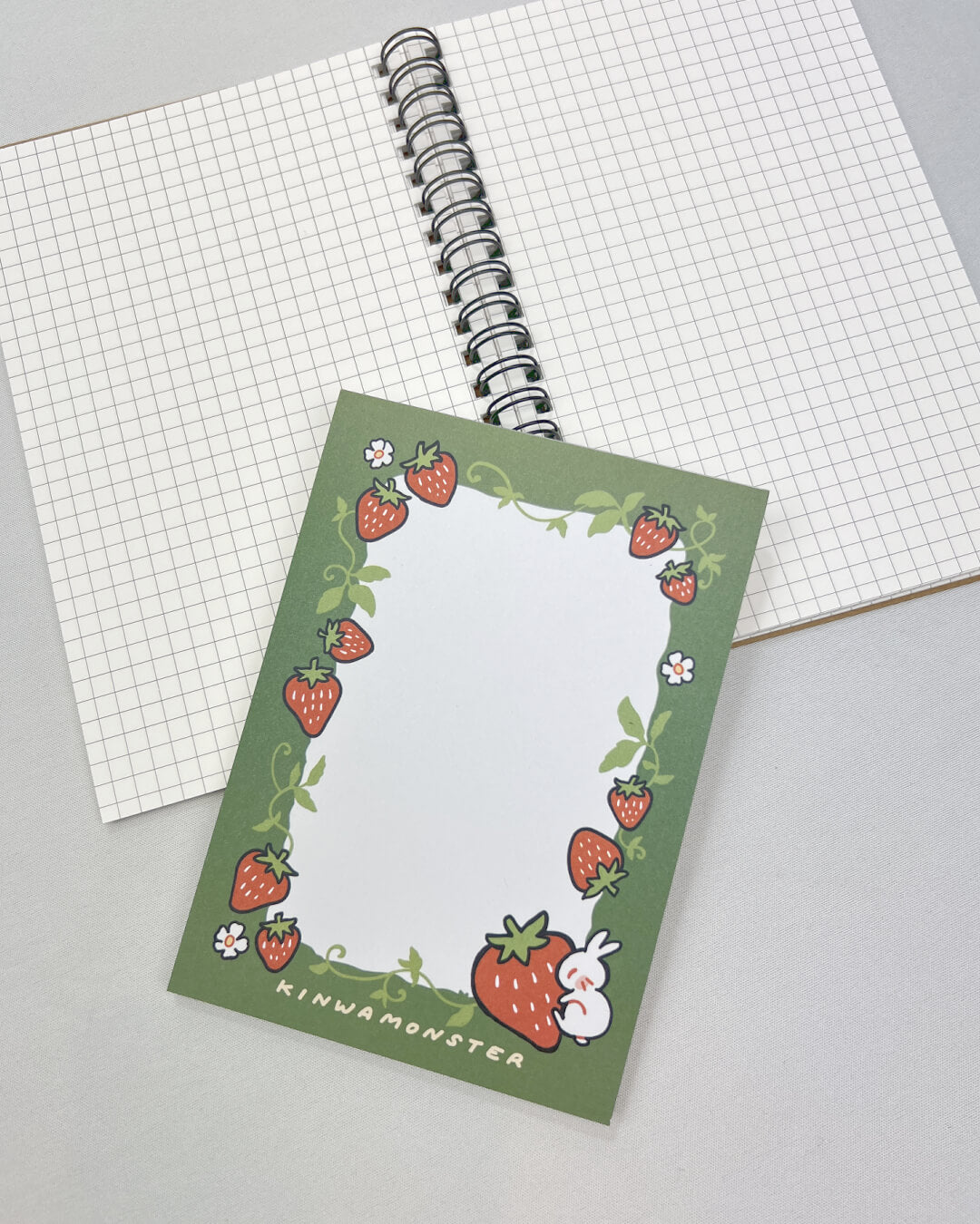 KINWAMONSTER long memopads featuring a field of strawberries (and one strawbunny)! Individually packaged! Great as gifts to your friends and loved ones!