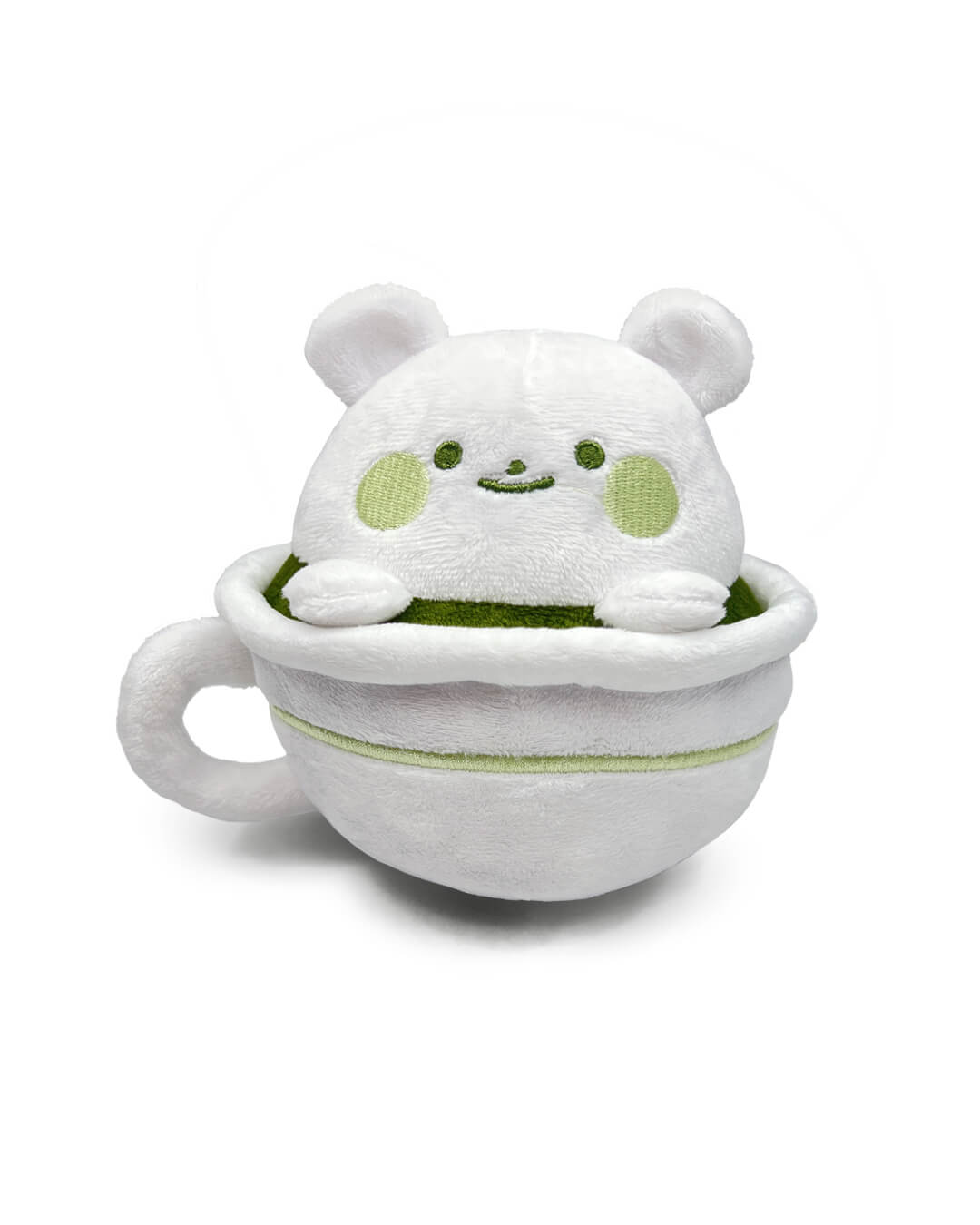 A nice warm travel-sized Matcha Bear latte plush toy! Take a long sip!