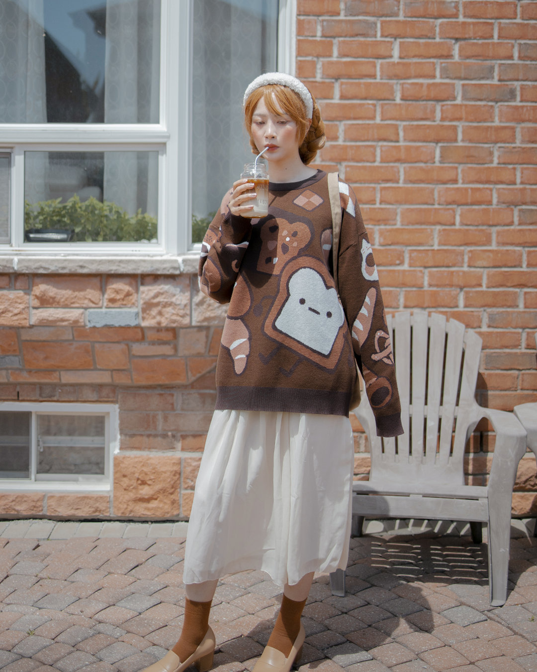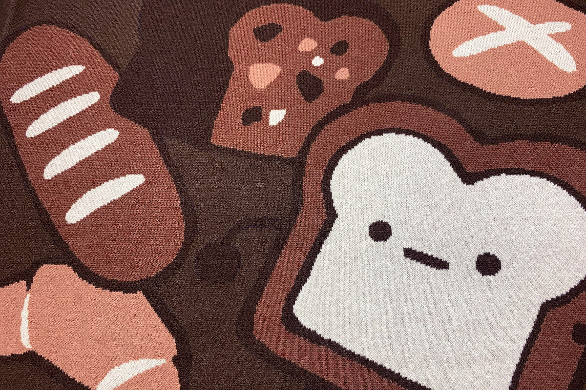 Design is the same for the front and back while each sleeve features different types of delicious pastries and bread! Super lightweight and soft! Model is 5'7'' and wearing a medium.