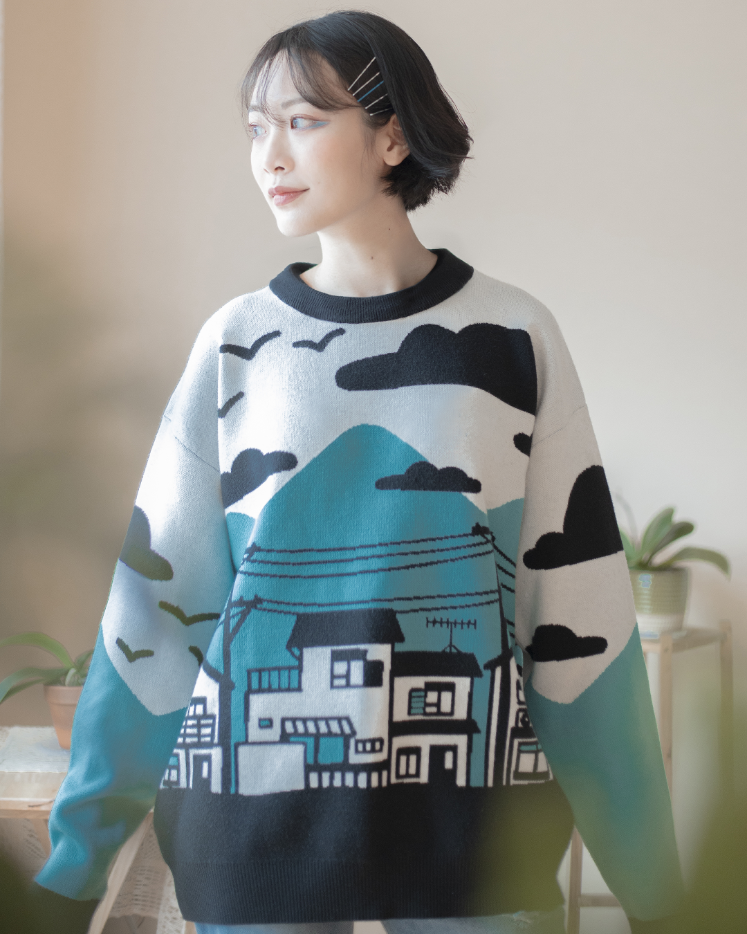 A wistful serene view of one's childhood neighborhood by the mountains. Lightweight Sweater! Model is 5'7'' and waring a medium!