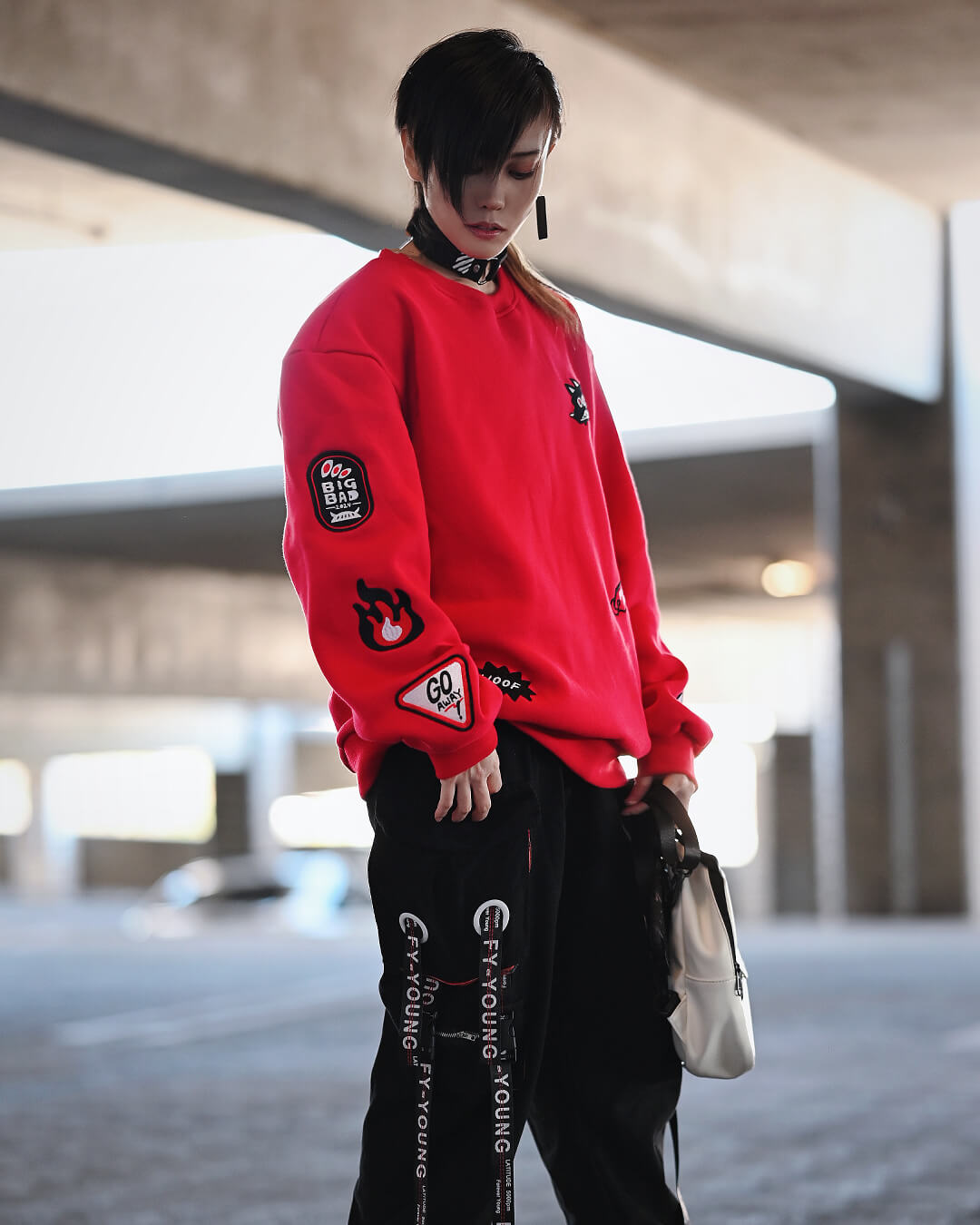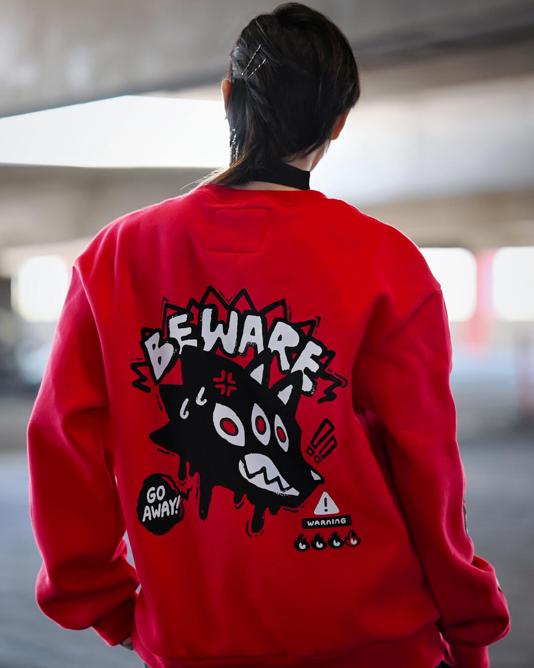 Original BIG BAD design by KINWA embroidered on a 50/50 cotton and polyester red sweatshirt. Distressed Silkscreen on the Backside. Interior Fleece lining.